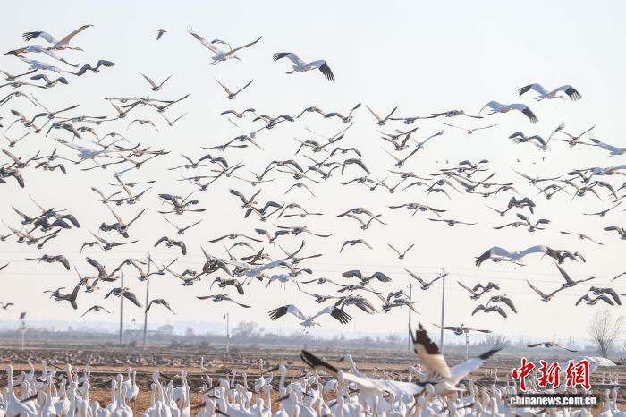 1月7日,江西上饶余干县,白鹤、白枕鹤、豆雁等候鸟聚集在鄱阳湖畔的康山垦殖场插旗洲分场越冬。鄱阳湖是中国最大淡水湖,也是全球候鸟重要栖息地、国际重要湿地。作为亚洲最大的候鸟越冬地,每年有数十万只候鸟来到鄱阳湖越冬,其中包括白鹤、白枕鹤、东方白鹳等珍稀候鸟。图为众多候鸟从天空中飞过。中新社记者 刘力鑫 摄