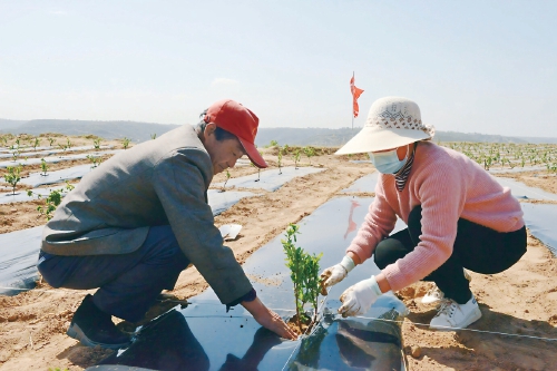 图为宁县种植户正在栽植金银花苗。 资料图