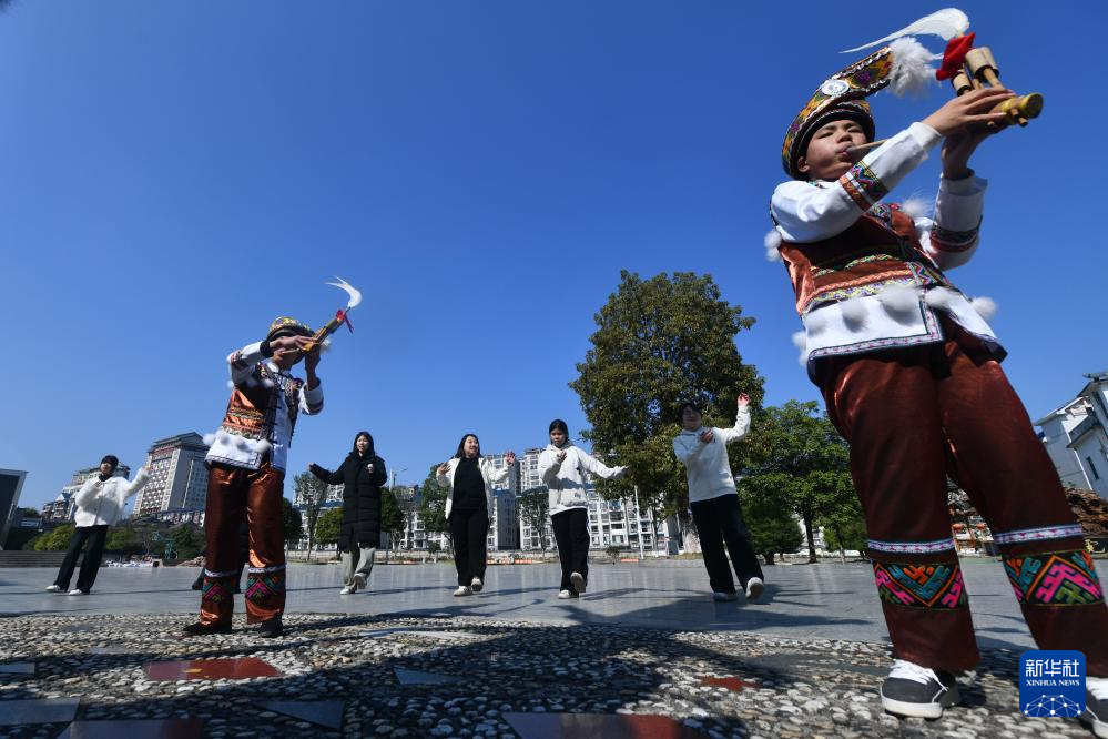 1月7日,在融水苗族自治县民族中学,西北工业大学研究生支教团成员王迪悦(右二)、王茜文(右四)、王璎珞(右五)和学生们跳芦笙踩堂舞。