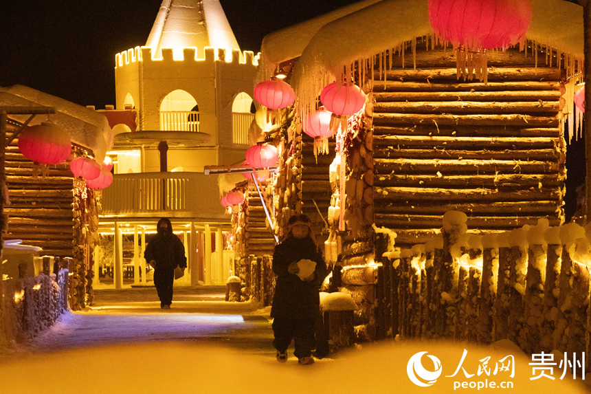 人民网六盘水1月9日电(黄小桃)1月7日晚,98栋覆雪木屋灯火温馨,红灯映雪、炊烟袅袅——这片位于贵州省六盘水市钟山区梅花山景区内的“南国雪乡”,成为游客争相打卡的冬日秘境。