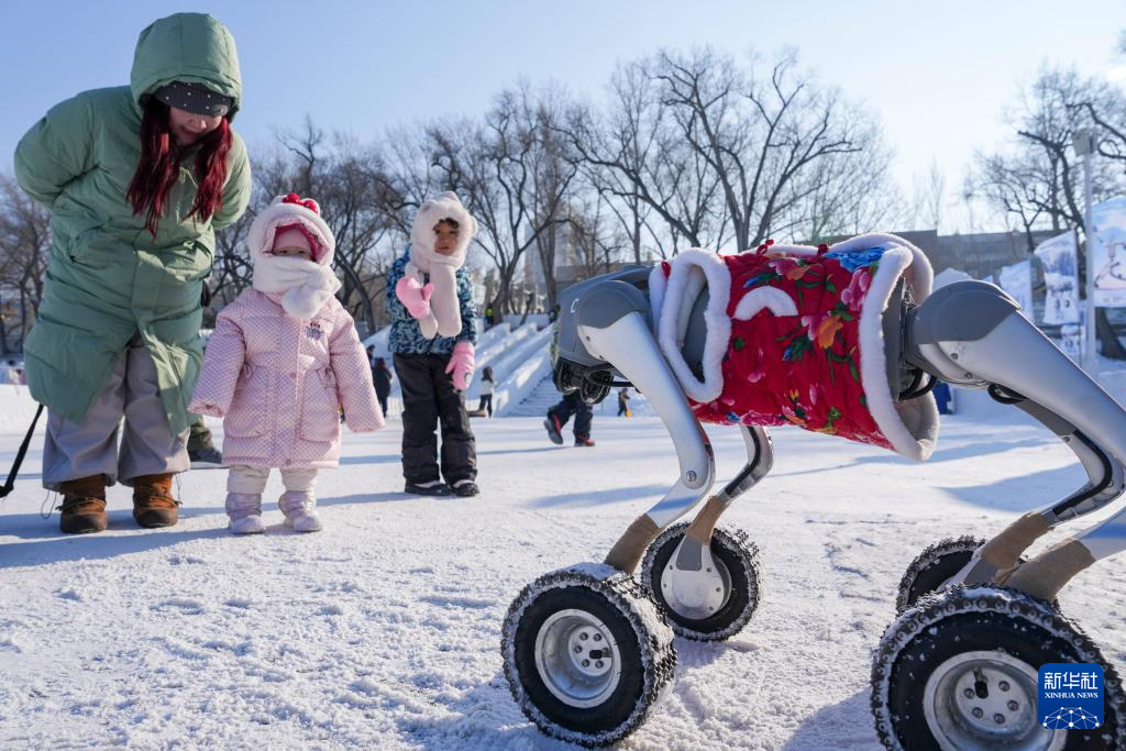 1月11日,家长和小朋友在松花江哈尔滨段江面上观察机器狗。