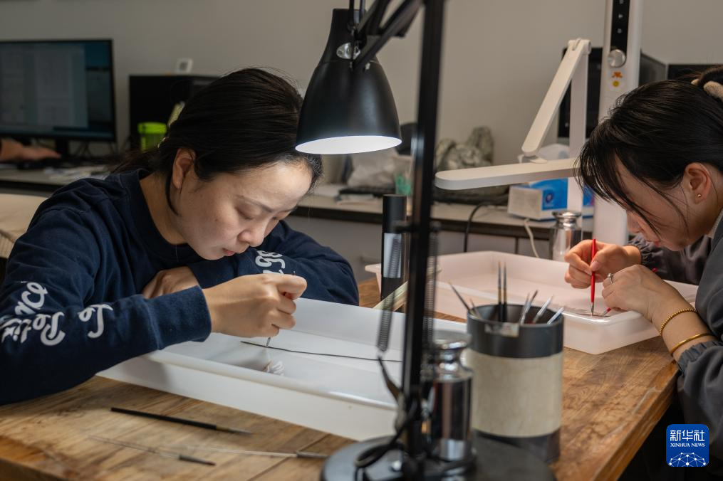1月9日,在湖北荆州文物保护中心,工作人员清理竹简。新华社记者 杜子璇 摄