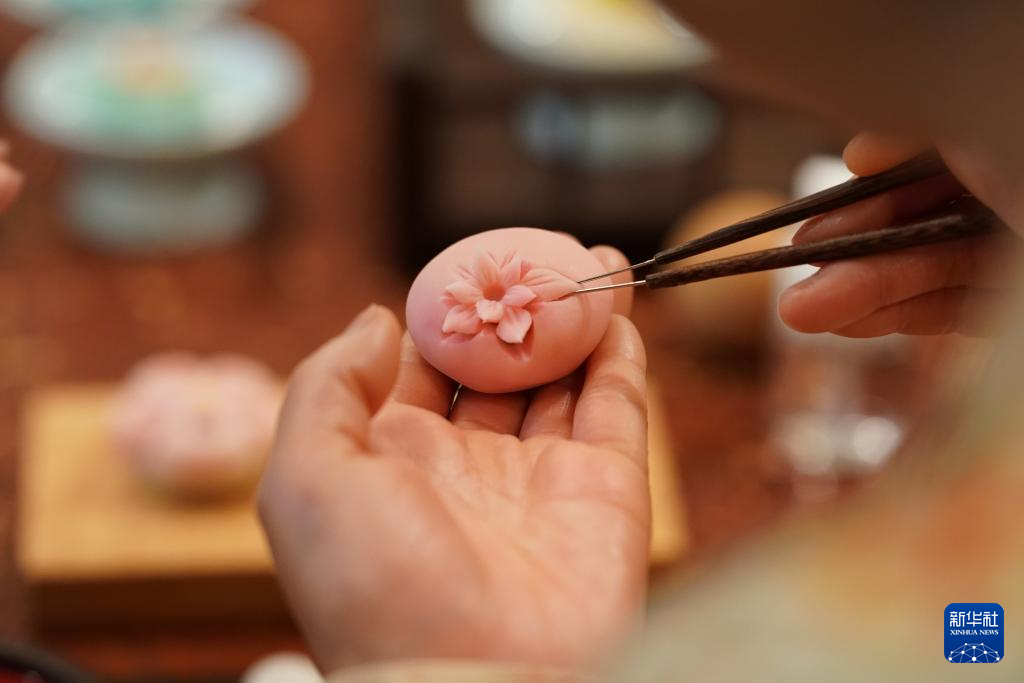 1月9日,制果师卓美艳在制作荷花造型的唐果子。