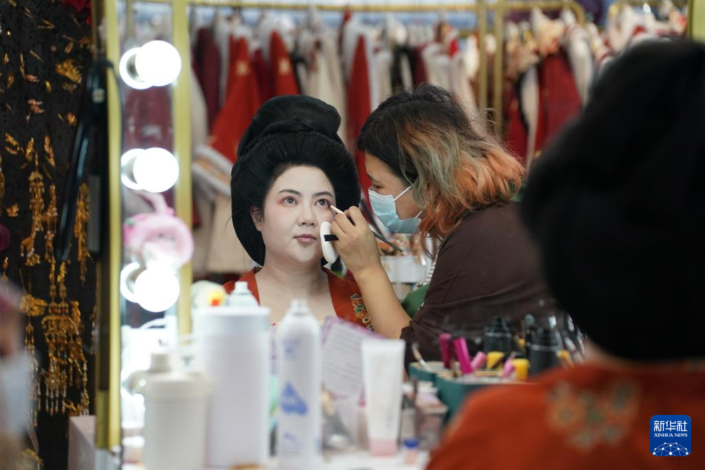 1月9日,李欢在进行唐果子制作体验项目前化唐妆。