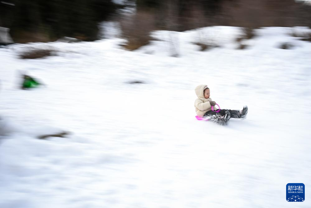 1月11日,在哈萨克斯坦阿拉木图市郊,一名儿童在雪地里玩耍。