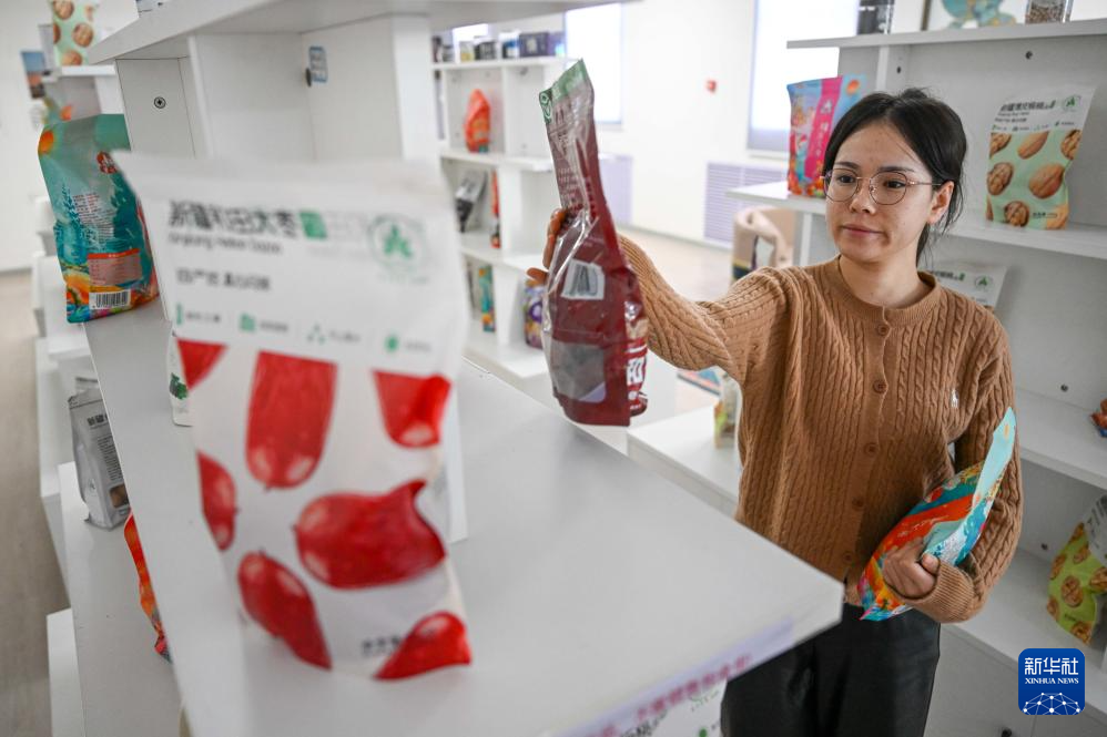 在新疆和田地区墨玉县,新疆自由落体网络科技有限公司的工作人员在整理展示商品(1月9日摄)。
