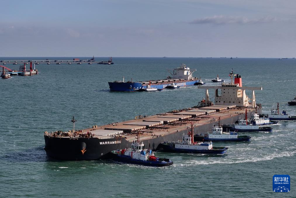 1月13日,两艘轮船在拖轮协助下向唐山港曹妃甸港区矿石码头靠泊(无人机照片)。