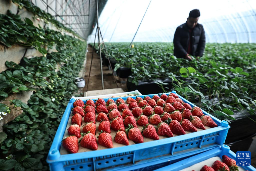 1月12日,在辽宁东港一个草莓大棚内,种植户在采摘草莓。
