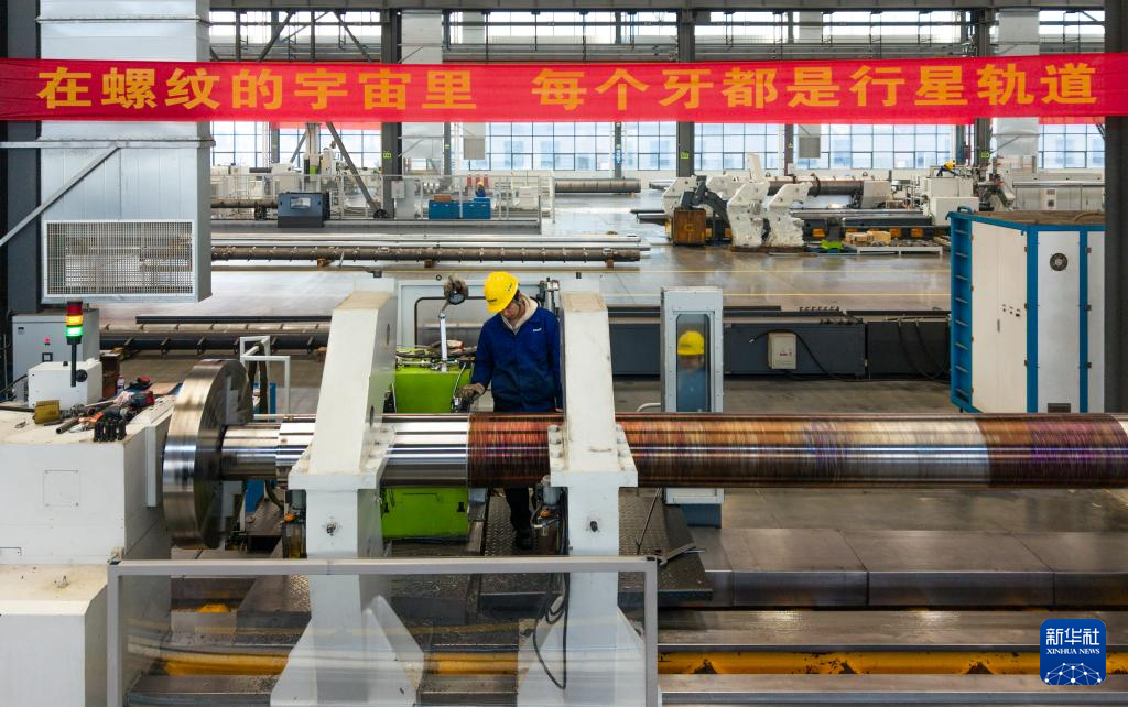 1月14日,在位于常德高新区的湖南特力液压有限公司,工人在生产超长型液压油缸(无人机照片)。