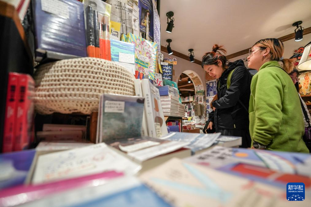 1月13日,游客在翠湖畔的特色书店挑选书籍。