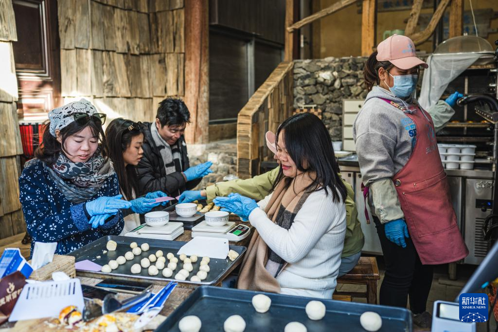 1月17日,游客在丽江市玉龙纳西族自治县白沙镇玉湖村体验制作鲜花饼。
