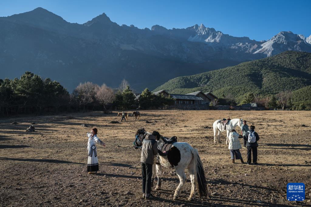 1月17日,游客在丽江市玉龙纳西族自治县白沙镇玉湖村的马场内拍照游览。