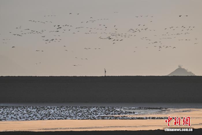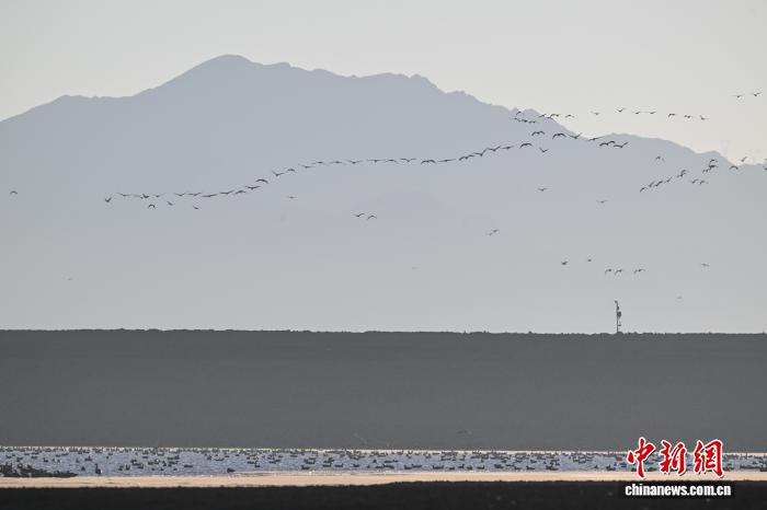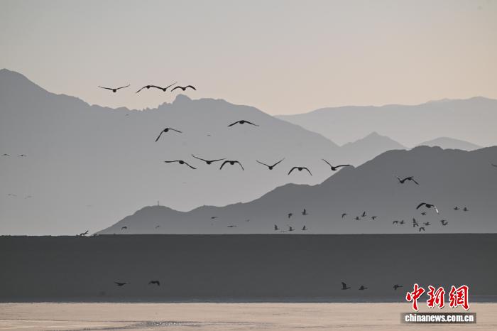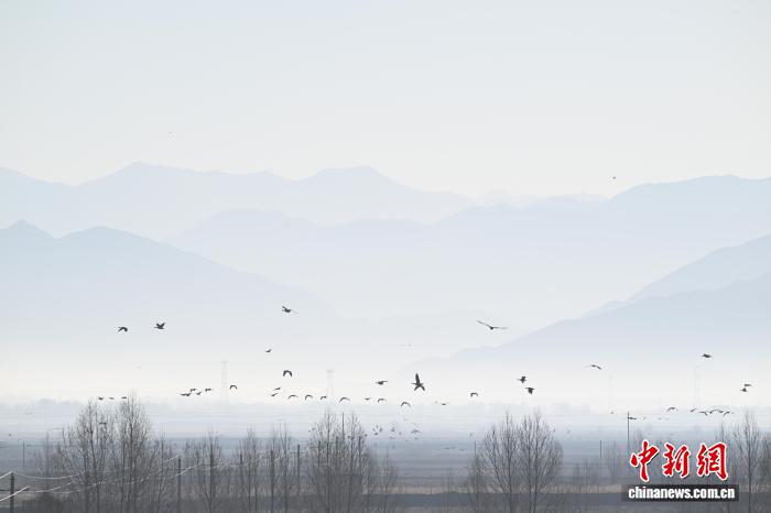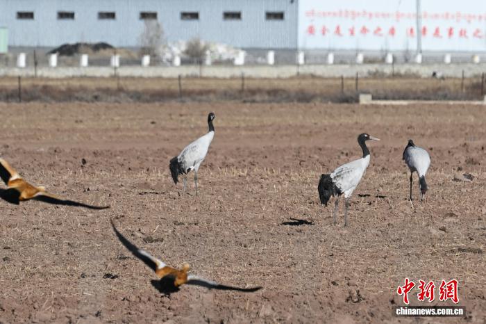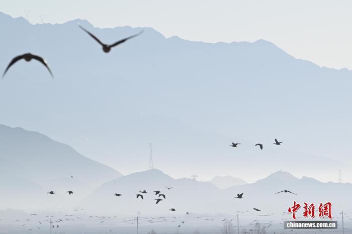 1月19日,西藏拉萨市林周县黑颈鹤自然保护区内,成群候鸟在此越冬栖息。这里的湿地、农田与水库构成绝佳栖息地,黑颈鹤、斑头雁、赤麻鸭等万余只候鸟在此集结。它们或凌空盘旋、或田间觅食,绘就高原生态画卷。中新社记者 贡嘎来松 摄