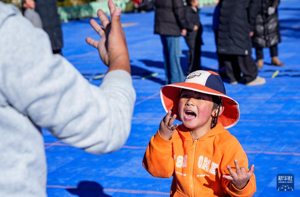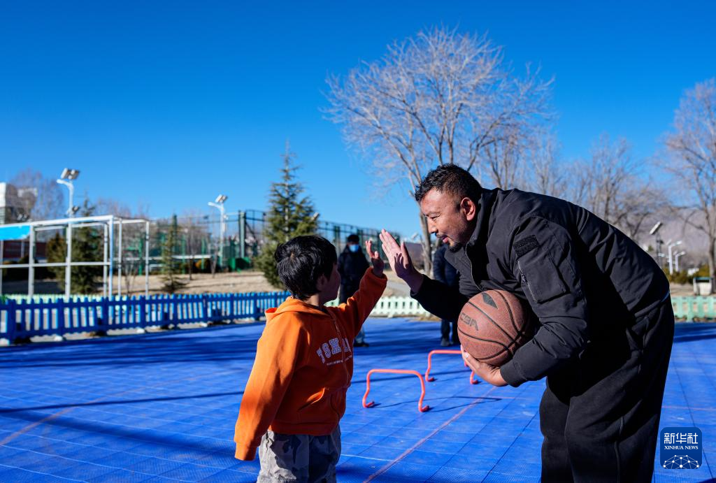 1月22日,在拉萨市全民健身体彩公园,“阳光残障儿童公益兴趣班”教师土旦格桑(右)在体适能训练课程间隙与一名残障儿童击掌。