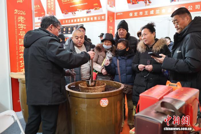 1月22日,山东临沂,民众选购老字号产品。当天,2026老字号国潮年货大集在临沂开幕。本届年货大集以“带老字号回家过年”为主题,打造10000平方米沉浸式年货消费新场景,设置年夜饭、幸福团聚、走亲访友、传统民俗体验区等特色展区。中新社记者 孙婷婷 摄