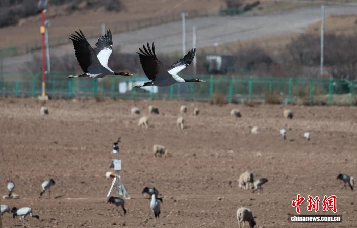1月22日,两只黑颈鹤从羊群头顶飞过。位于云南省迪庆藏族自治州香格里拉市的纳帕海省级自然保护区是高原湿地,也是鸟类的“度夏越冬”乐园。越冬高峰期,国家一级、二级重点保护野生动物黑颈鹤、黑鹳、灰鹤等鸟类数量约5万只。中新社记者 黄兴鸿 摄