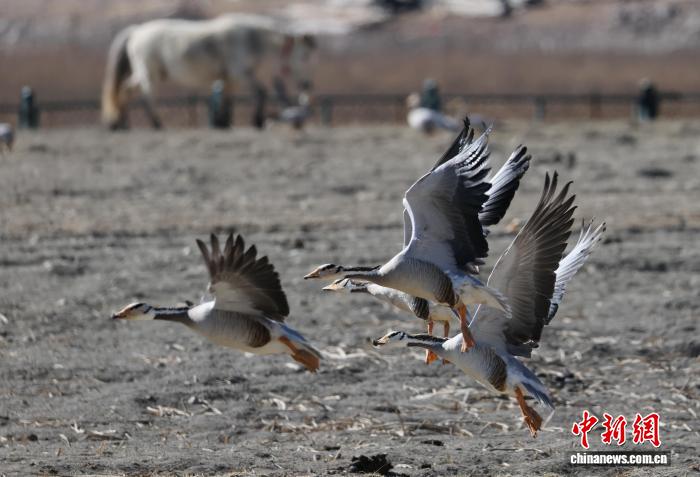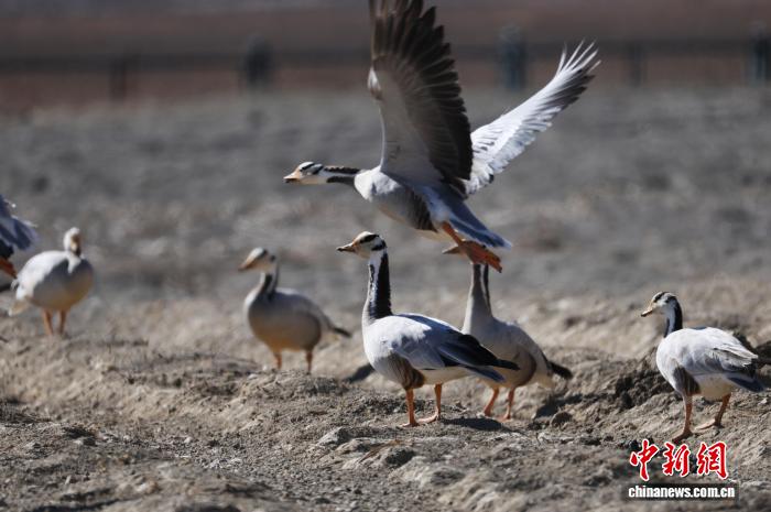 1月22日,一群斑头雁在纳帕海嬉戏。位于云南省迪庆藏族自治州香格里拉市的纳帕海省级自然保护区是高原湿地,也是鸟类的“度夏越冬”乐园。越冬高峰期,国家一级、二级重点保护野生动物黑颈鹤、黑鹳、灰鹤等鸟类数量约5万只。中新社记者 黄兴鸿 摄