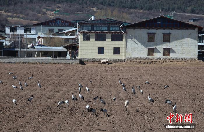 1月22日,候鸟与马匹、村庄构成和谐画卷。位于云南省迪庆藏族自治州香格里拉市的纳帕海省级自然保护区是高原湿地,也是鸟类的“度夏越冬”乐园。越冬高峰期,国家一级、二级重点保护野生动物黑颈鹤、黑鹳、灰鹤等鸟类数量约5万只。中新社记者 黄兴鸿 摄