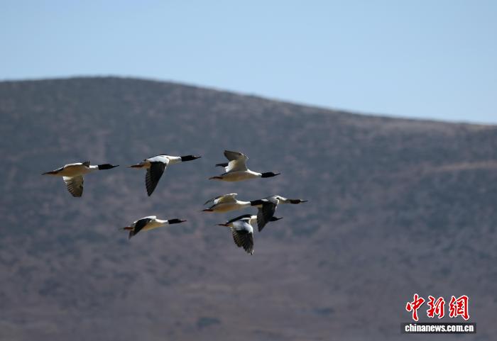 1月22日,一群秋沙鸭在空中飞翔。位于云南省迪庆藏族自治州香格里拉市的纳帕海省级自然保护区是高原湿地,也是鸟类的“度夏越冬”乐园。越冬高峰期,国家一级、二级重点保护野生动物黑颈鹤、黑鹳、灰鹤等鸟类数量约5万只。中新社记者 黄兴鸿 摄