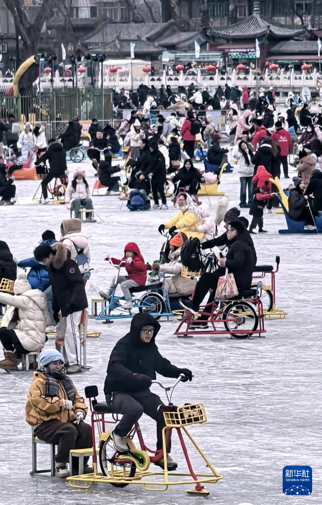 1月25日,市民在什刹海冰场上玩冰上自行车等冰雪娱乐项目。