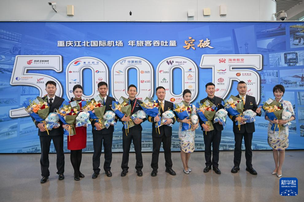2025年12月31日,乘务人员在重庆江北国际机场年旅客吞吐量突破5000万人次的纪念墙前合影。