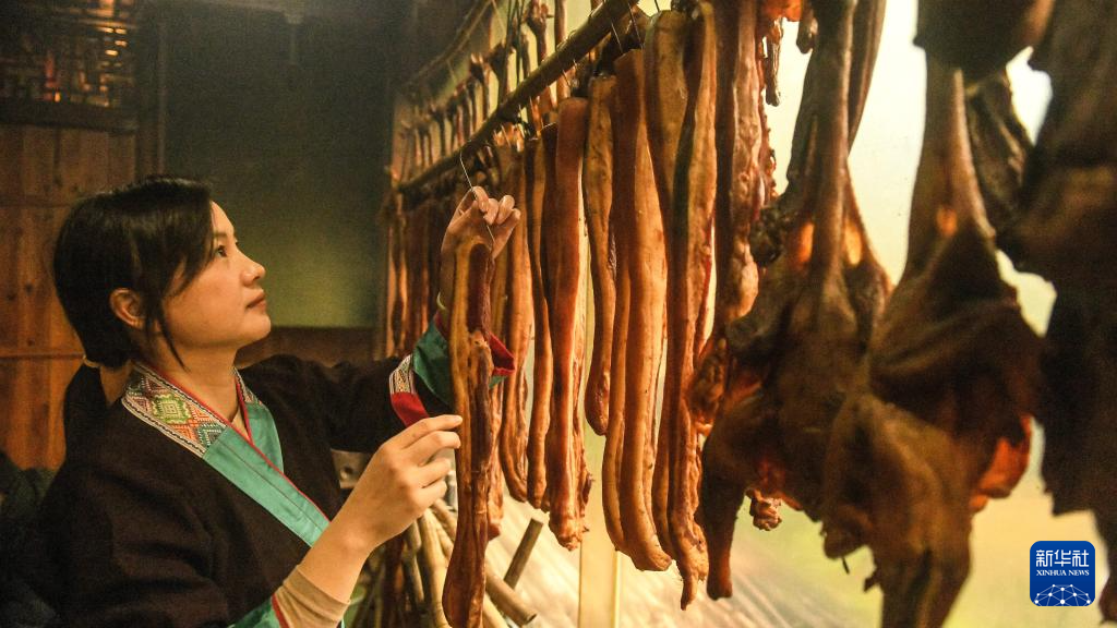 1月26日,在三江侗族自治县斗江镇牙林村,侗族群众在晾晒自己制作的腊味。