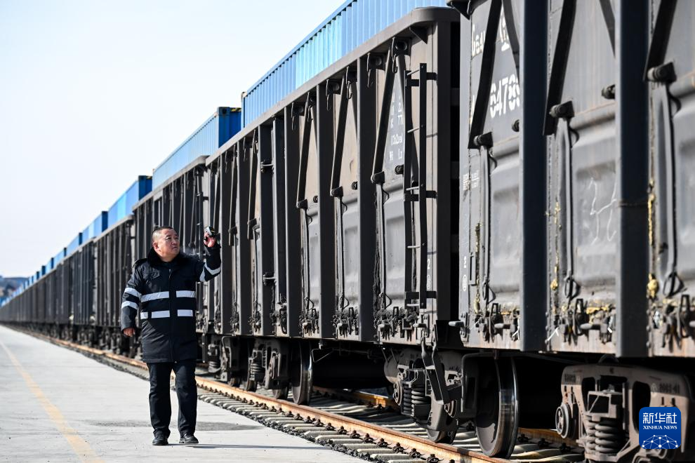 1月27日,工作人员在乌兰察布中欧班列集散中心巡查中欧班列装车情况。