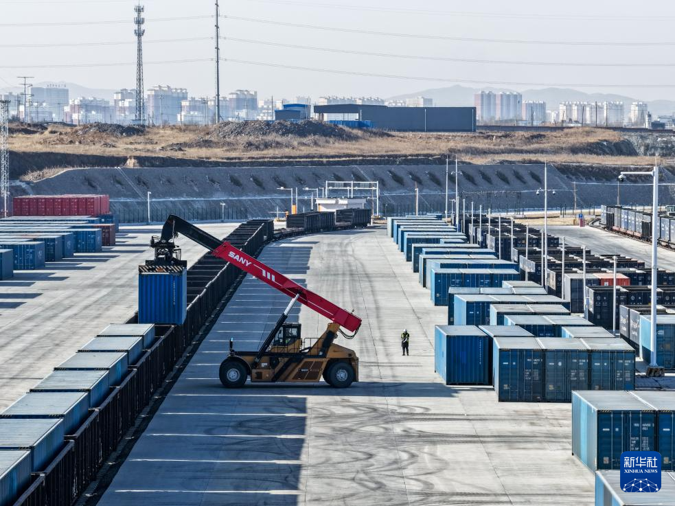 1月27日,一辆正面吊车在乌兰察布中欧班列集散中心内装运集装箱(无人机照片)。
