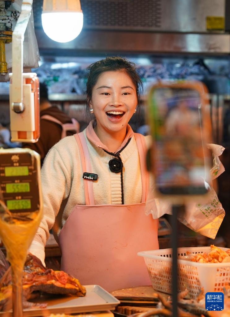 1月27日,一名摊主在昆明大观篆新农贸市场内通过直播方式售卖鸡肉。
