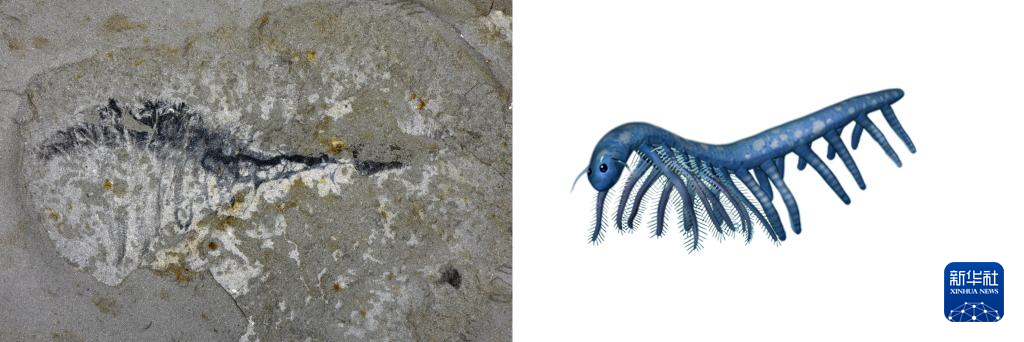 花垣生物群叶足动物-柯林斯虫化石图(左)和复原图。