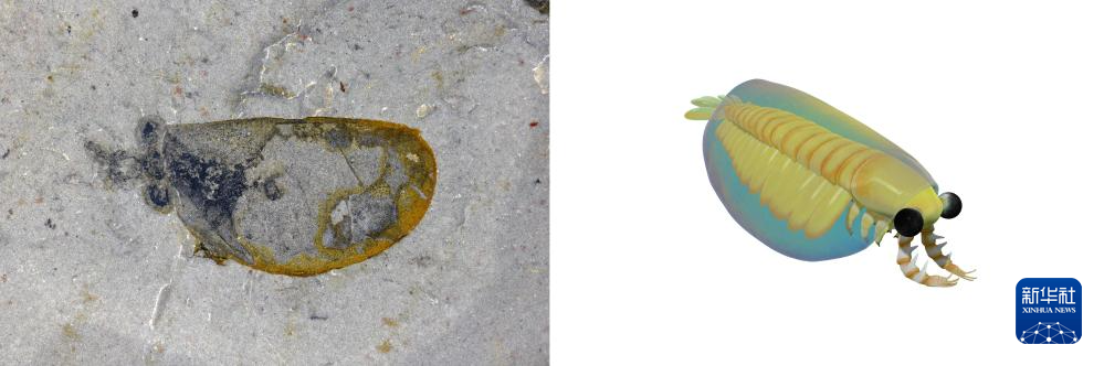 花垣生物群节肢动物-苏鲁斯虾化石图(左)和复原图。