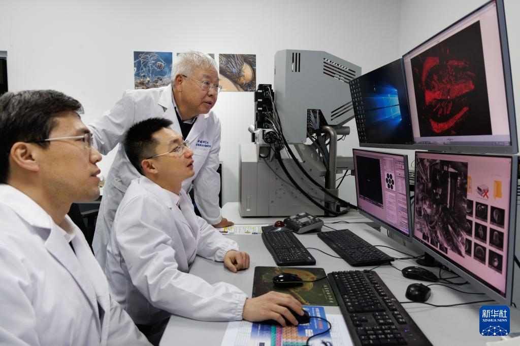 1月22日,在中国科学院南京地质古生物研究所拉曼-场发射联用扫描电镜实验室,中国科学院院士、研究员朱茂炎(后),研究员赵方臣(前),副研究员曾晗(中)在观察扫描电镜扫描的化石图。
