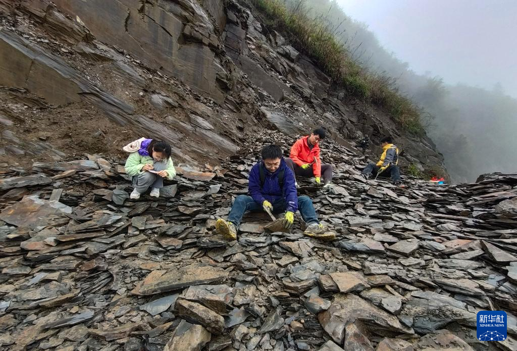科研团队在湖南省湘西土家族苗族自治州花垣县石栏镇磨子村首次野外科考中采集化石(2021年4月7日摄)。
