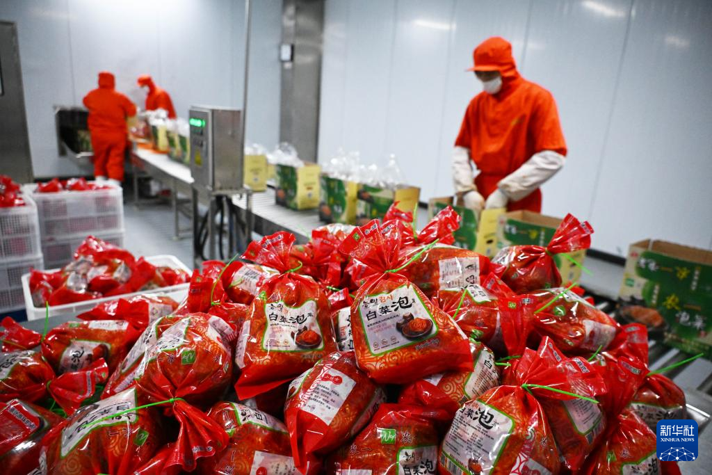 1月29日,青岛农一食品有限公司员工在包装销往韩国市场的泡菜。