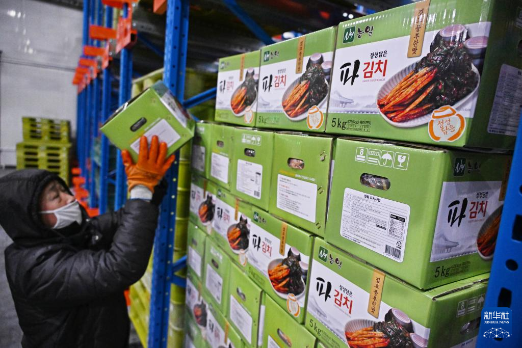1月29日,青岛农一食品有限公司员工在查验即将发往韩国的泡菜。