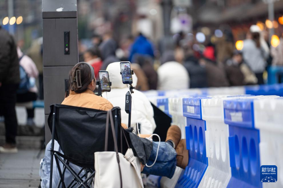 1月21日,在重庆市网红地标洪崖洞,主播在滨江路人行道上架设设备直播。
