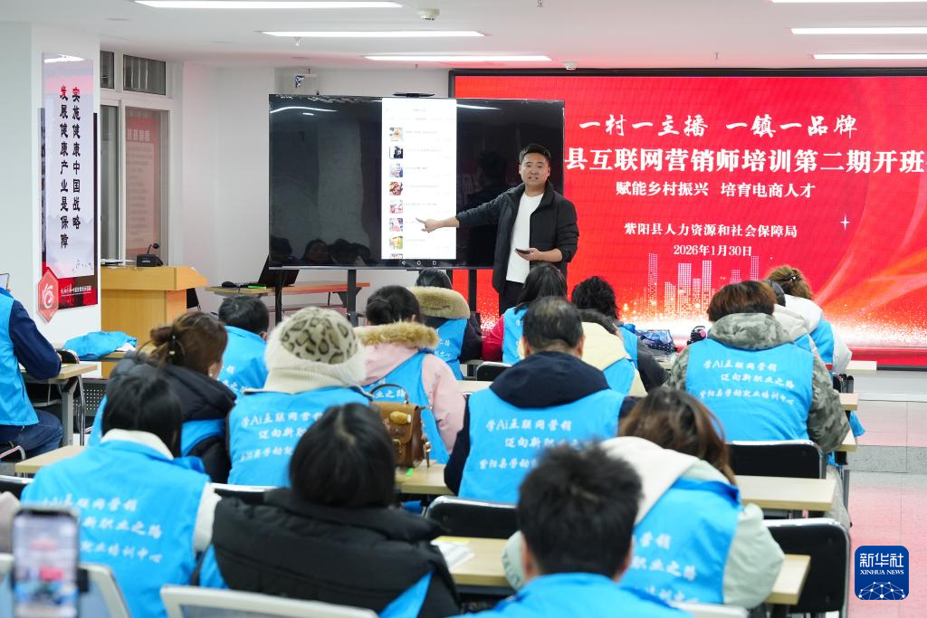 1月30日,在安康市紫阳县开展的网络营销主题培训课程上,讲师在为来自当地镇村的学员授课。