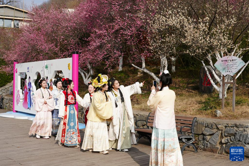 1月22日,游客在安康市宁陕县梅子镇安坪村“子午梅苑”景区拍照游玩。