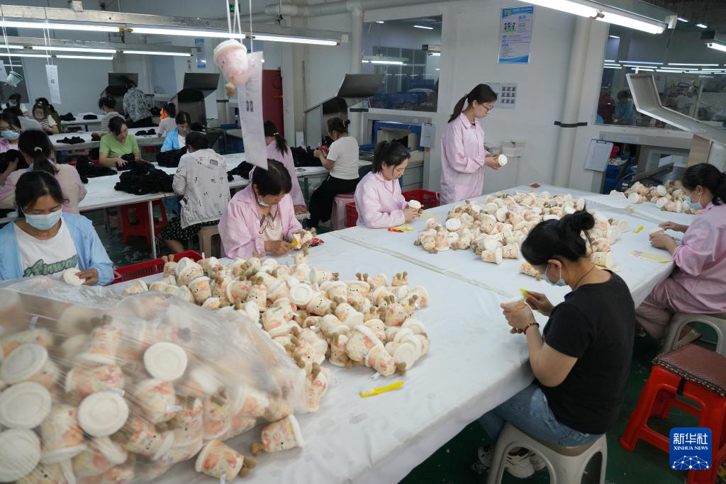 在安康市汉滨区五里工业集中区的一家毛绒玩具企业车间,来自当地社区的工人加工毛绒玩具(2025年5月12日摄)。