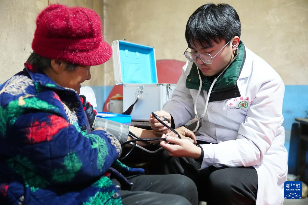 1月29日,安康市岚皋县堰门镇青春村村医冯莫林(右)在为村民左立秀诊疗。