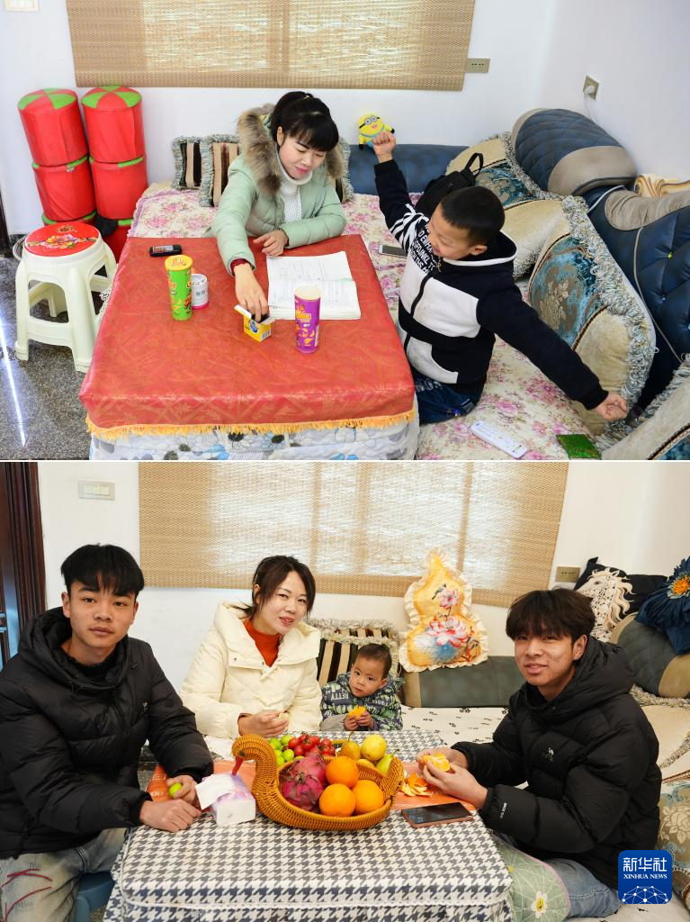 拼版照片:上图为安康市紫阳县蒿坪镇黄金村村民雷洁(左)在易地搬迁后的新家中给大儿子张明泽辅导功课(2017年2月9日摄);下图为雷洁(左二)和她的大儿子张明泽(右一)、二儿子张明懿(左一)、小儿子张翰瑞(右二)在同一地点合影(2026年1月30日摄)。
