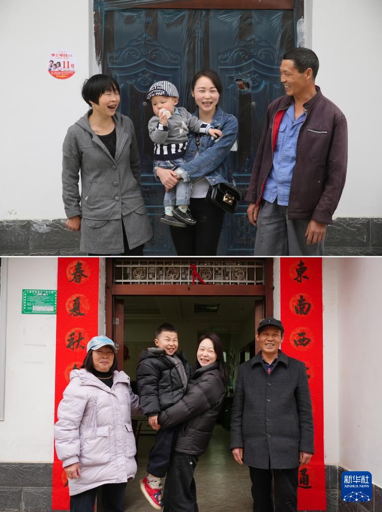 拼版照片:上图为安康市紫阳县蒿坪镇黄金村村民王宇平(右一)和家人在易地搬迁后的新家门前合影(2016年4月21日摄);下图为相同人物在相同地点合影(2026年1月30日摄)。