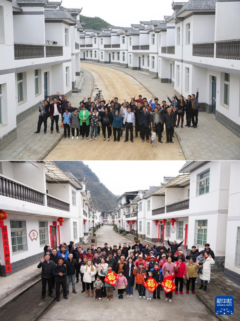 拼版照片:上图为安康市紫阳县蒿坪镇黄金村村民在易地搬迁后的安置点上与新房合影(2016年4月21日摄);下图为黄金村村民在安置点上合影(2026年1月30日摄)。