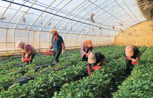 农户正在大棚里采摘新鲜草莓。 农民日报全媒体记者 李盎 摄