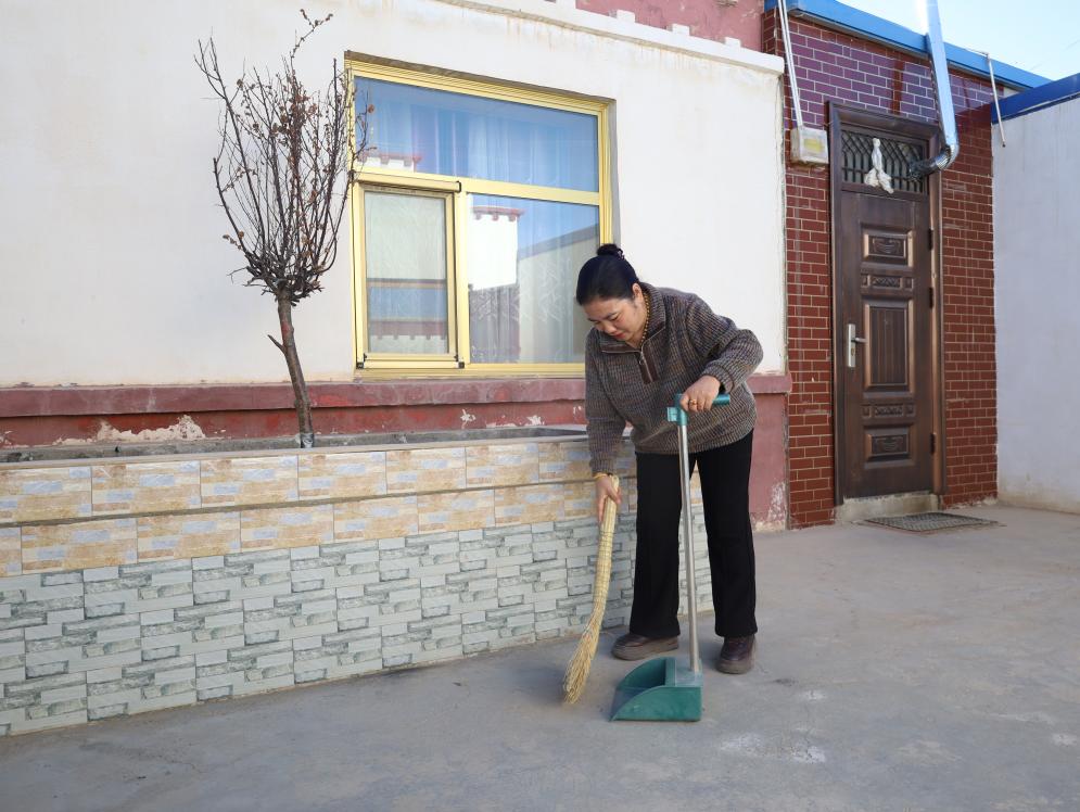 1月22日,长江源村村民小马正在打扫自家院子。新华社记者解统强 摄