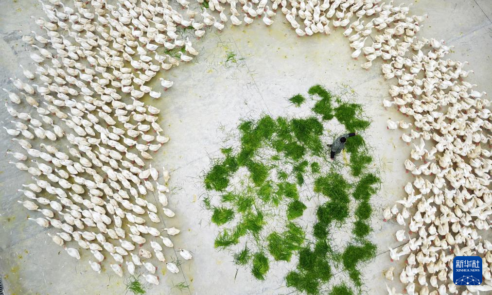 工人在贵州省锦屏县铜鼓镇马台生态种鹅养殖基地投放草料(2020年3月11日摄,无人机照片)。