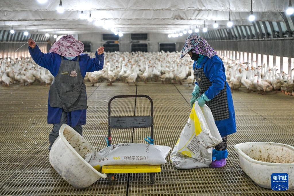 工人在贵州省锦屏县新化乡欧阳村的生态鹅育雏基地给种鹅投食(2026年1月21日摄)。