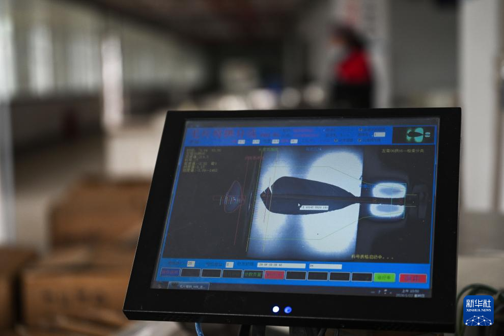在贵州锦屏经济开发区羽毛球生产基地,工人操作机器进行毛片弯拱分选(2026年1月22日摄)。