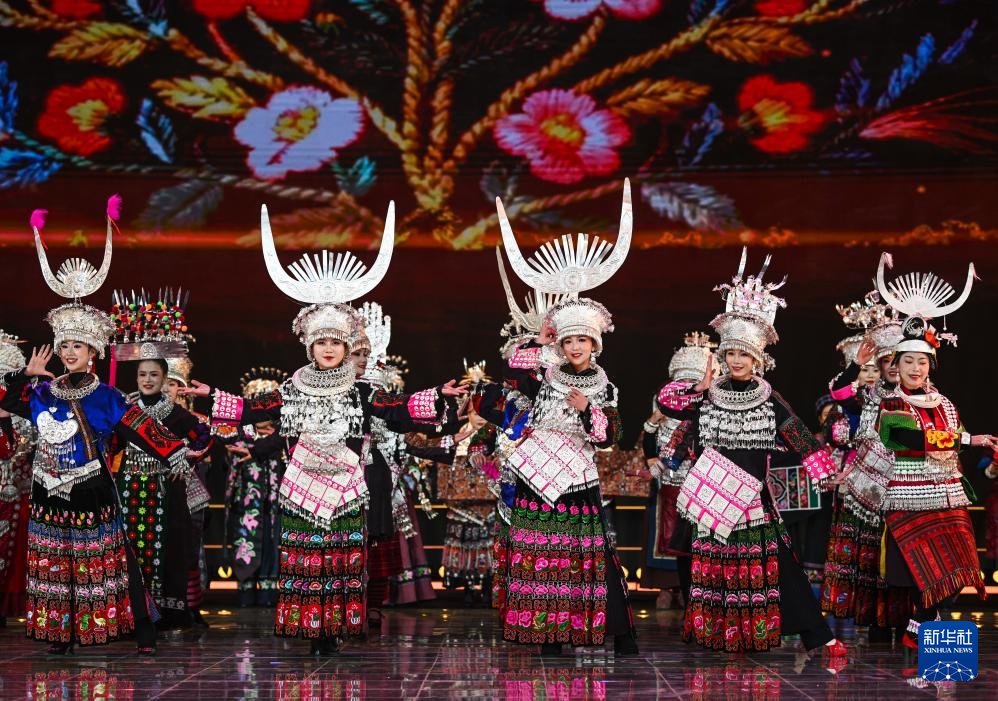 2月3日,人们在2026贵州“村晚”现场展示民族服饰。