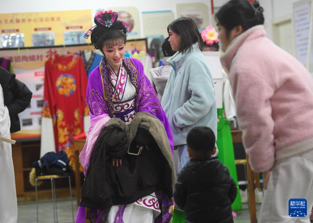 1月30日,在诸暨市浬浦镇陶姚村,诸暨市越剧团的演员在候场时跟观众交流。